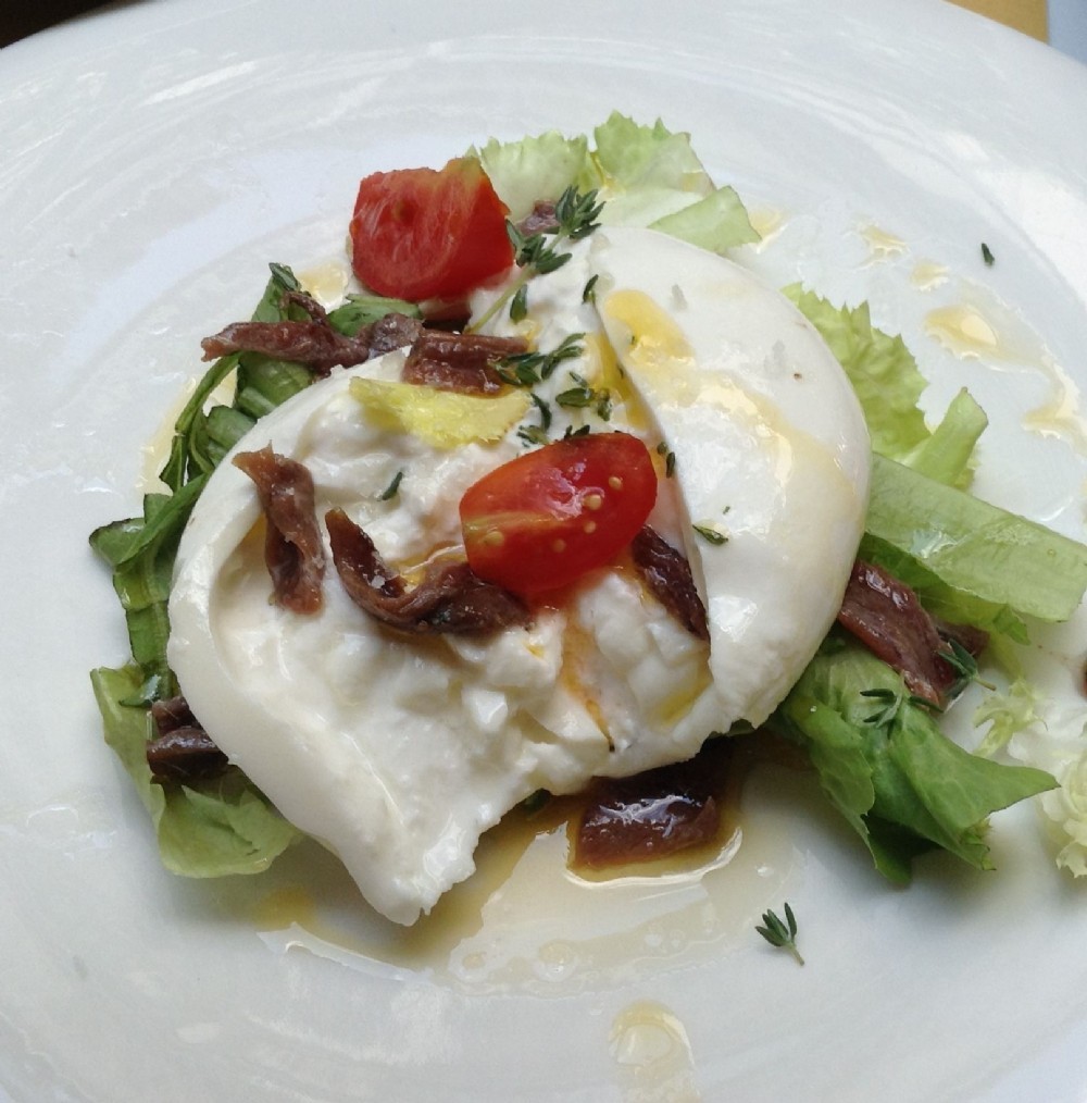 burratina con alici del mar cantabrico, pomodorini, rucola