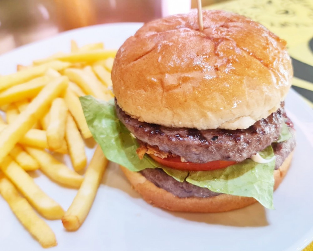 Panino con 2 hamburger di manzo scottona 100%, ketchup, maionese, insalata, pomodoro, formaggio, e patatine